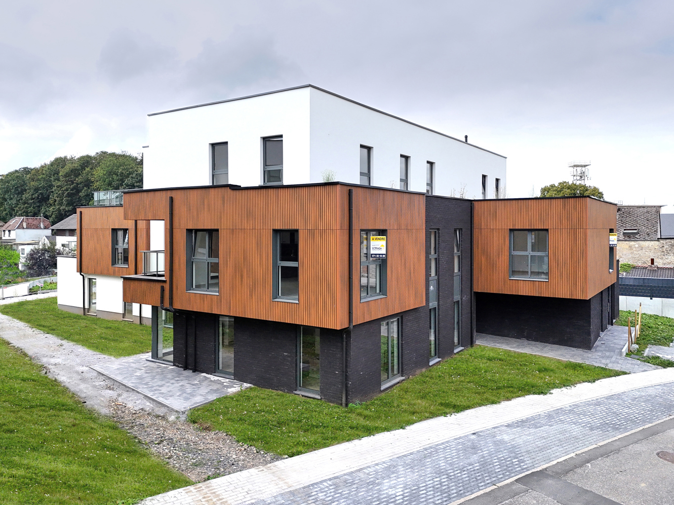 – » Coeur de Granit » Bloc E : 2 maisons jumelées et 5 cellules modulables à destination de bureaux.Des bâtiments situés dans un environnement verdoyant, autour d’un parc commun, dont le point commun est une architecture contemporaine d’une grande sobriété ;Une association de matériaux de façades qui contribuent à la personnalité de chacun des immeubles (briques, crépi et bardage en bois reconsitué). Un réseau de sentiers piétons intérieurs qui traversent la zone de parc. Des agencements intérieurs extrêmement variés. Des appartements agrémentés, au minimum, d’une terrasse sous la forme d’un balcon ou aménagée sur une zone de toiture plate.Possibilité d’acquérir un parking en sous-sol à partir de 22.000€ HTVA et d’une cave moyennant un minimum de 3.500€ HTVA. Délais de livraison projeté (en fonction des conditions climatiques) : encore à déterminer. Les prix ne comprennent ni la TVA sur les constructions, ni les droits d’enregistrement sur le terrain, ni les frais de notaire et les frais d’acte de base. Les frais de raccordement s’élèvent à 4.500 € HTVA.